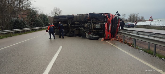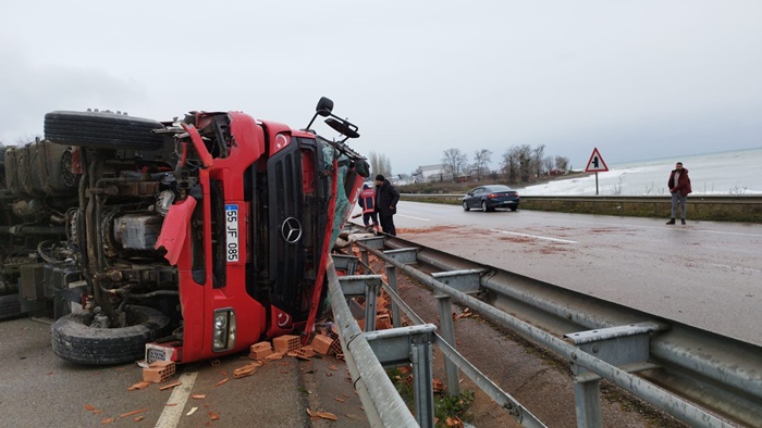 Edinilen bilgilere göre, Gerze yönüne seyreden 55 JF 085 plakalı kamyon, sürücüsünün direksiyon hakimiyetini kaybetmesi sonucu yan yattı. Kazada kamyondaki tuğlalar yola saçılırken, sürücü bariyerlerin üzerine devrilen kabinde sıkıştı.